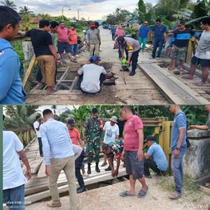 Pemerintah Kecamatan bersama Polri/TNI dan warga sekitar turun tangan memperbaiki kerusakan jembatan.