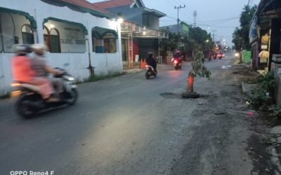 “Lubang yang menganga tadi dibiarkan dan ditinggal pergi oleh petugasnya sehingga saat hujan lubangnya terisi air sehingga ada pengendara sepeda motor perempuan yang jatuh disitu. Kejadian ini sekitar sepuluh hari yang lalu sekira jam 16.00 wib, korbannya mengalami luka-luka. Untuk mencegah laka lantas lagi maka warga memasang Ban serta Pion Lantas merah yang ditambahi sama dahan pohon untuk tandanya jalan njeglong,” terangnya.
