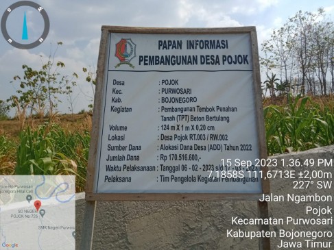 Tembok Penahan Tanah (TPT) beton Bertulang yang ada di Desa Pojok RT 003 RW 002, Kecamatan Purwosari, Kabupaten Bojonegoro, dengan volume 124m x 1m x 0,20cm, dengan besaran anggaran Rp. 170.516.600 dari alokasi anggaran ADD tahun 2022, waktu pelaksanaan 06/02/23 hingga 17/03/23 guna untuk menanggulangi air yang meluber atau erosi tanah dirasa kurang efesien dan tidak ada manfaatnya.