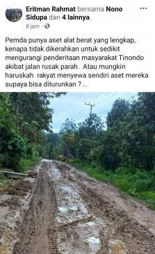 “Pemda punya aset alat berat yang lengkap, kenapa tidak dikerahkan untuk sedikit mengurangi penderitaan masyarakat Tinondo akibat jalan rusak parah. Atau mungkin haruskah rakyat menyewa sendiri aset mereka supaya bisa diturunkan?,” tulisnya.