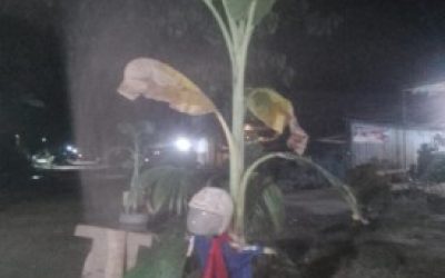 Pohon pisang yang ditanam, dibalut dengan ban bekas serta diberi coretan singkat dan padat.